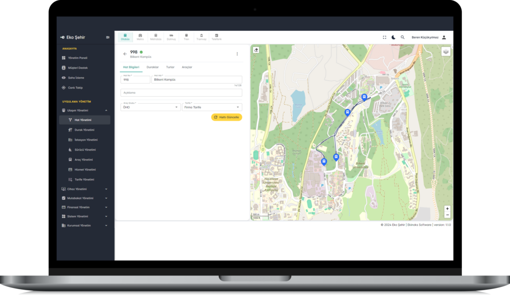 Toplu taşıma yönetiminde çeşitli ihtiyaçları tek bir çatı altında buluşturan web tabanlı uygulamamız, sunduğu canlı takip, bayi gişe yönetimi, müşteri yönetimi, hat yönetimi, analiz ve raporlama gibi birçok özellikle ön plana çıkıyor. Canlı takip özelliği sayesinde taşıma araçlarının anlık konumunu izleyebilir, bayi gişe yönetimi ile satış noktalarını etkin bir biçimde yönetebilir, müşteri yönetimi ile kullanıcı deneyimini optimize edebilir, hat yönetimi ile güzergahları planlayabilir ve analiz, raporlama ile de verileri detaylı bir şekilde inceleyerek karar alabilirsiniz. Bu kapsamlı özellik seti, toplu taşıma sistemlerini daha verimli, güvenilir ve kullanıcı dostu bir hale getirerek şehir ulaşımını en üst düzeye çıkarmak için tasarlanmıştır.